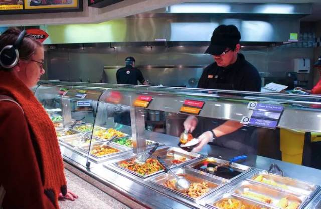熊貓快餐裡面就像中國的食堂,廚師將菜炒好後,裝入一尺見方的餐盤內放在前台保溫銷售,但為了保證菜品新鮮,每盤量不大,賣完後再炒,如果45分鐘後仍舊沒有賣出,會重新換新。