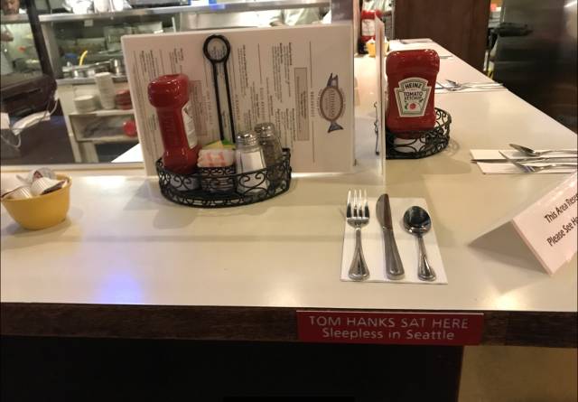 位於派克市場的Athenian海鮮餐廳也由於電影中湯姆·漢克斯來此用餐而聞名遐邇,餐廳入口處就能看見一張《西雅圖不眠夜》的電影海報,離入口不遠處的一張餐桌,貼出了一張指示牌,會告訴你這就是當年湯姆·漢克斯的用餐之處。當然,你也可以點一份與電影中一樣的食物:漢堡包和新鮮蛤蜊。或許只有坐在同樣的位置,品嚐同樣的菜餚之時,才能深刻的體會到電影中表達的“愛,終究能夠治愈受傷的心靈”的含義吧。